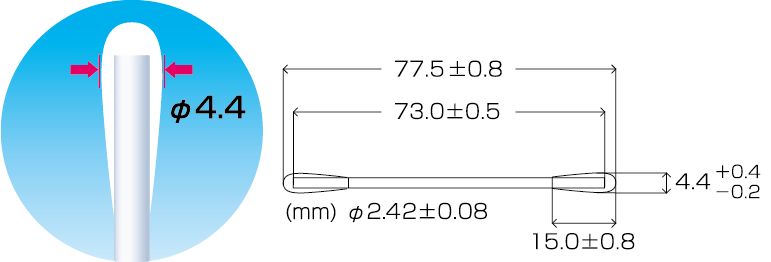 BB-002はBB-001よりさらにヘッドを細くした3インチサイズベイビータイプの綿棒です。ヘッドは球状でリントが少なく吸水性に優れていますので溶液を浸して利用する場合にとても便利です。顕微鏡・光学器・コネクターのクリーニング、精密機械の製造工程において使用されています。また焼却が可能なので、工業用綿棒を大量に消費する工場に向いています。