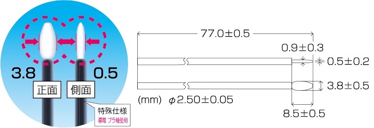 BB-001FLよりもさらに間隔の狭い箇所の清掃が可能になったBB-013のフラットタイプです。先端部分には高密度の綿を利用し、IPAなど溶剤を利用しても先端が崩れません。